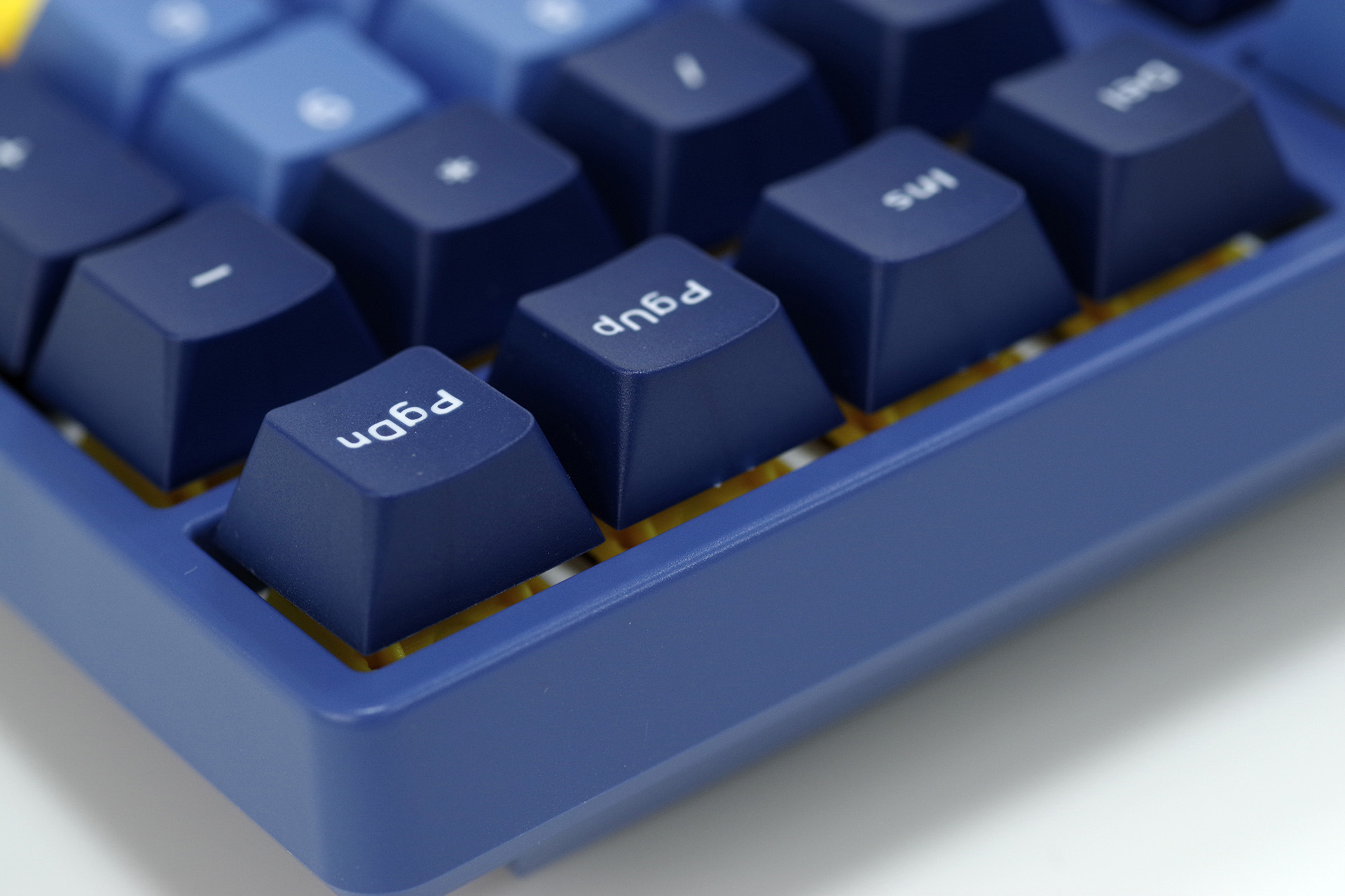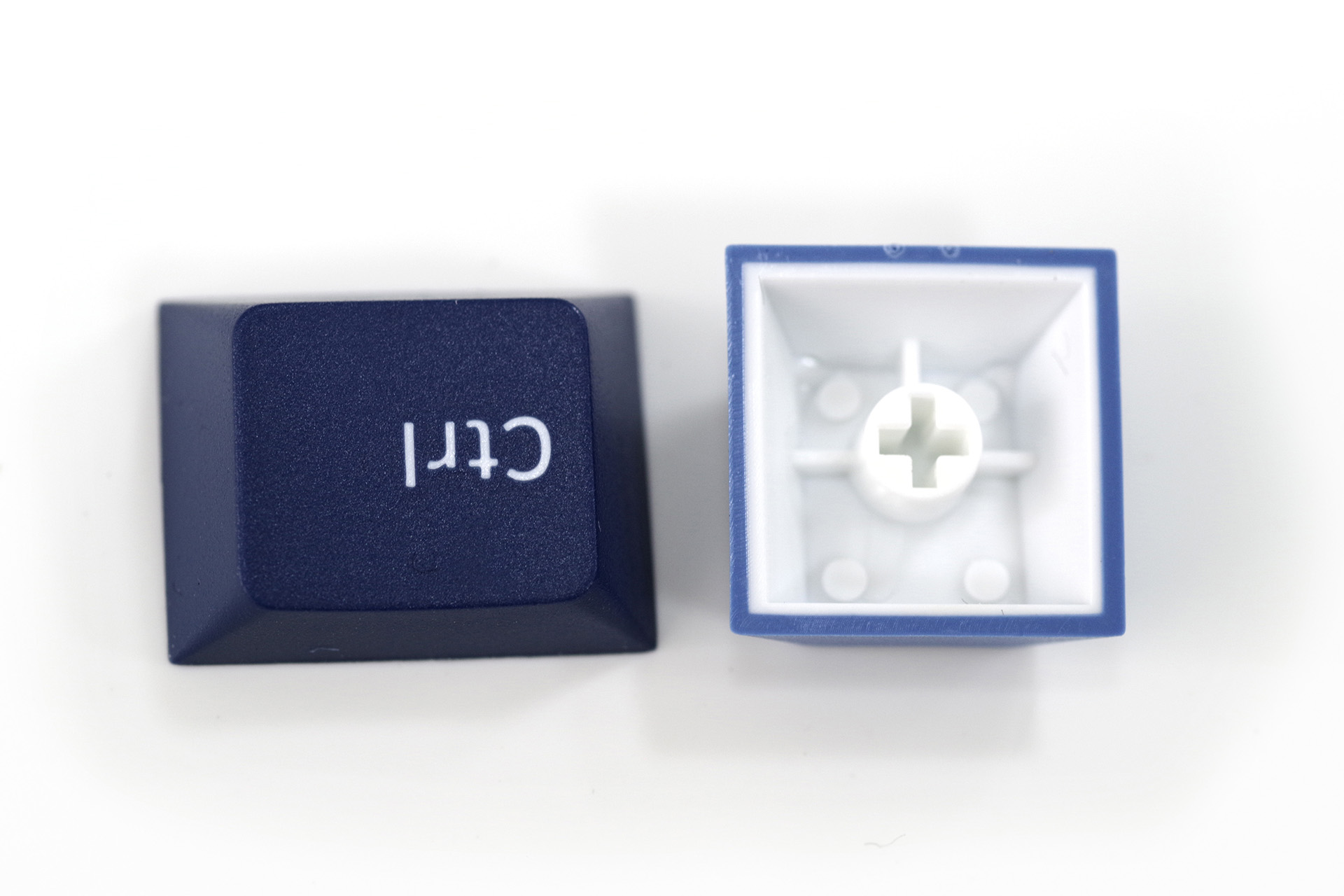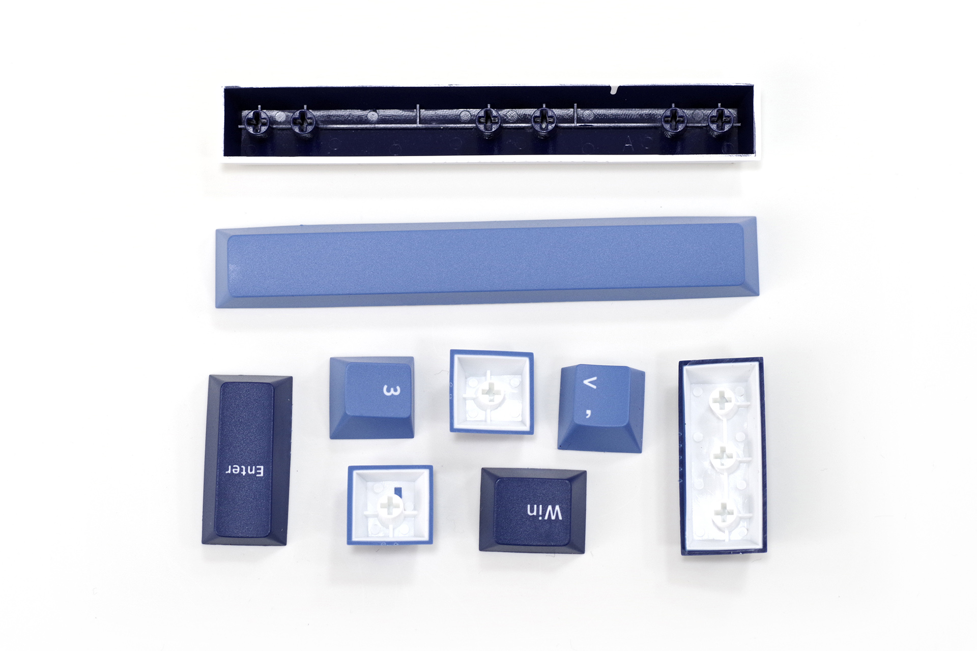 双色PBT键帽,原厂高度,五面磨砂,表面颗粒感很明显,但触感其实偏细腻,初上手很干爽;底边锐利,顶边作了圆弧处理,显得相对柔和;闭口字符,印字匀称;水口基本位于键帽底边上缘,正常视角很难看得到,处理得还是挺不错的;内壁厚实,菊花规整,双色工艺非常到位,另外还有空格键“强行双色”的谜之设定;不足之处是大键有轻微的桶形形变。