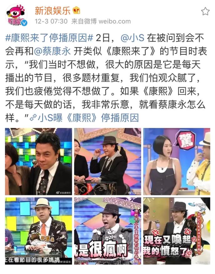 其实讲真,《康熙来了》停播之后,蔡康永和小S都肉眼可见flop了。要知道《康熙来了》虽然钱少枯燥,但它能保住蔡康永和小S在娱乐主持界的地位。咖位不掉,那么商业价值也不会掉,其所带来的周边收益不可估计。而停掉节目之后,两位主持人也有过重新合体、上大陆节目,只可惜没能重返"康熙"巅峰。