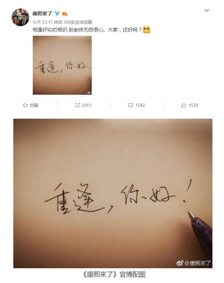 《康熙来了》停档近五年来,坊间常常有节目即将重启的消息。像是三年前,《康熙来了》官方微博突然更新,配文提到了"相逢",配图用到了"重逢",这种种都似乎意有所指,令不少粉丝激动不已。但最后,节目依然没有重启,粉丝们都感觉有些失望和失落。