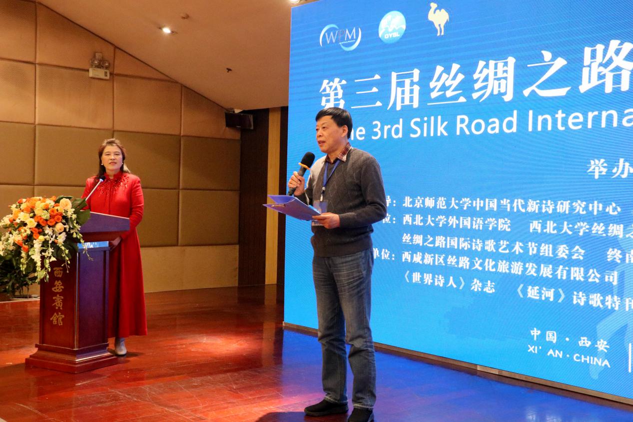 西北大学外国语学院院长、第三届丝绸之路国际诗歌节组委会副主任、国际诗歌奖初评委员会主任胡宗锋先生宣读第三届丝绸之路国际诗歌奖获奖诗人名单。