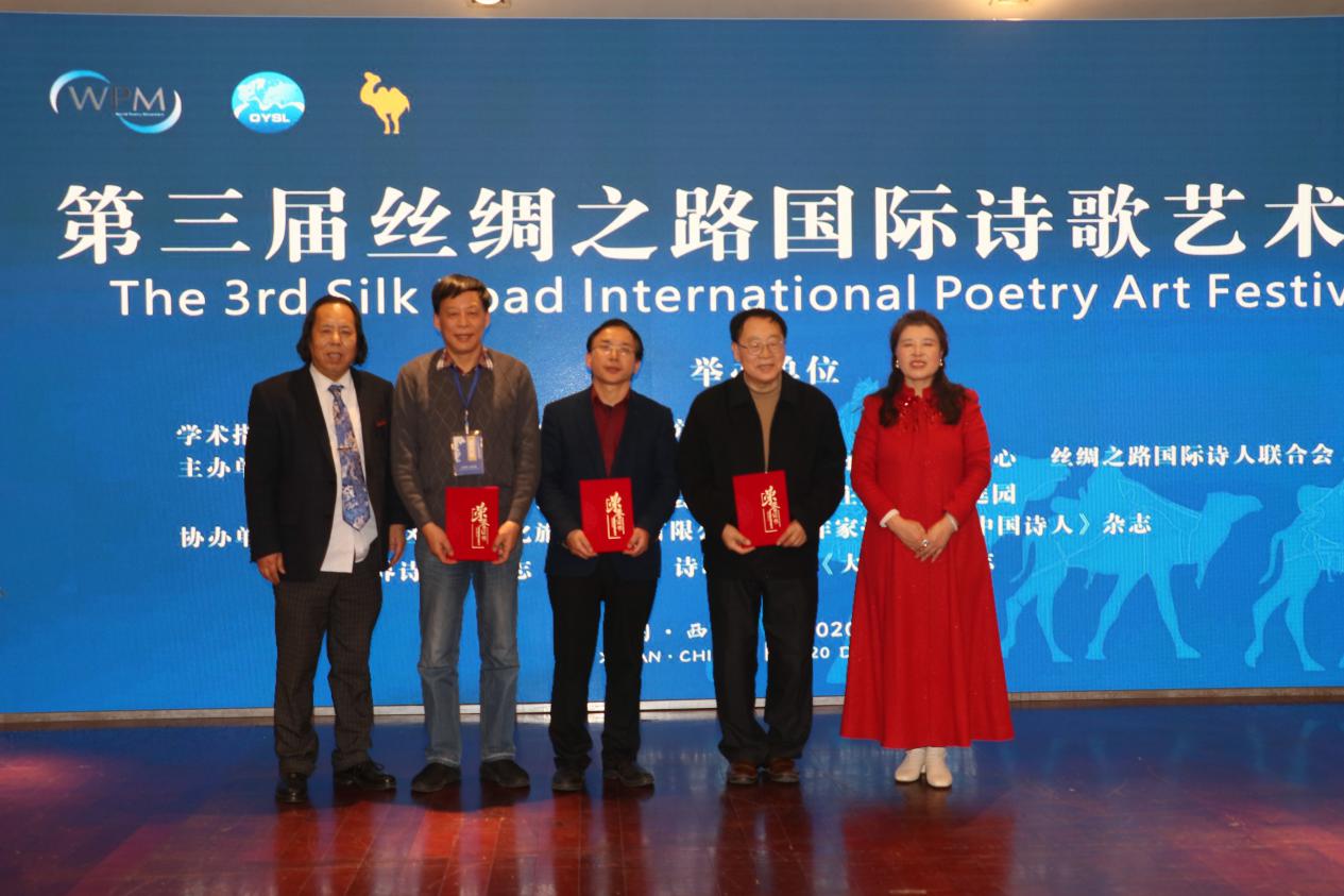 西北大学外国语学院院长胡宗锋,西北大学丝绸之路国际诗歌研究中心主任王芳闻,向著名国际诗人、诗评家黄亚洲、吴思敬、谭五昌先生颁发高级顾问证书。