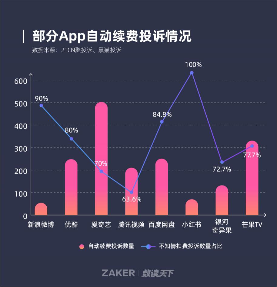 其中," 不知情自动续费扣款 " 占小红书 " 自动续费 " 投诉的比重高达 100%,共有 250 名用户投诉这一问题;新浪微博这个数字则高达 90%,优酷和百度网盘该问题投诉的占比也达到了 80% 以上。