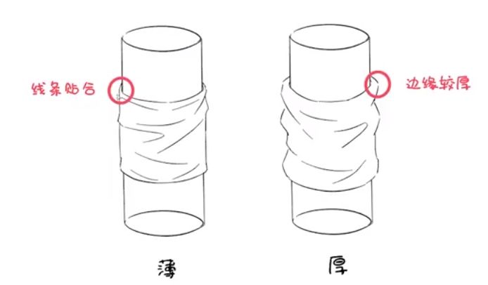 薄的衣服会更加容易产生褶皱,所以它的褶皱间距都会比较小,厚的衣服本来就有硬度,所以它的褶皱间距会更加的大一些,轻薄的衣料褶皱可以用比较细还有更加密集的线条来绘制,另外还要注意贴合感哦,加厚的衣料边缘起伏比较大