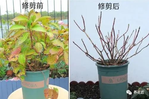3、清理干净落叶和乱枝绣球和月季一样喷施一次石硫合剂,给盆土和枝条杀菌杀虫。