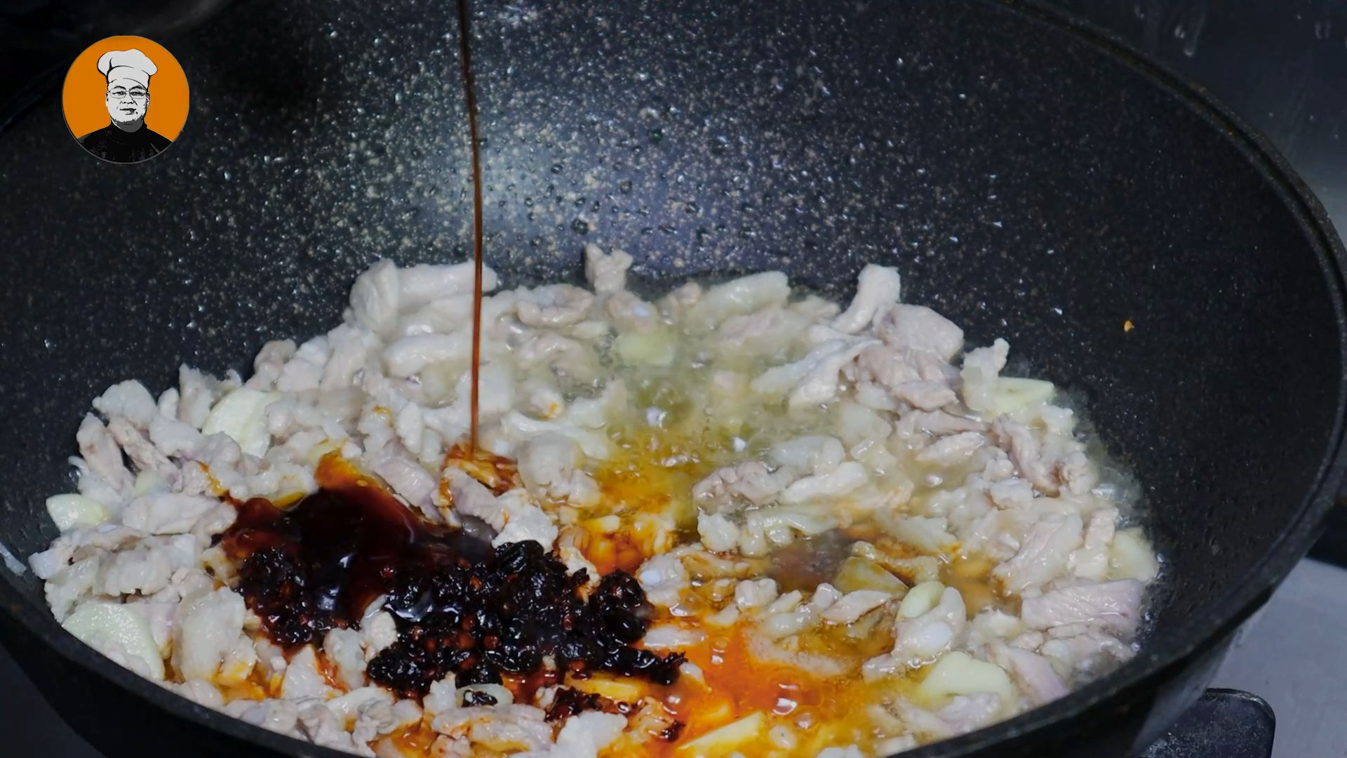 5、热锅倒油,放入大蒜片爆香,再放入肉丝煸炒出油脂,锅边淋入料酒去腥,放入蚝油、两勺老干妈豆豉、生抽、白糖一勺,翻炒入味,再放点老抽上色,翻炒均匀,盛出备用