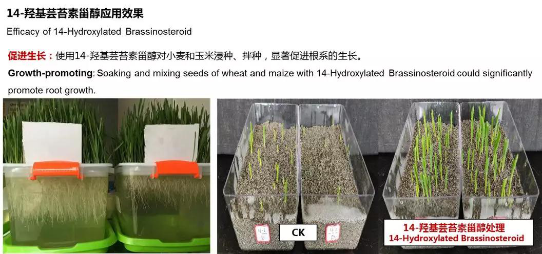 14-羟基芸苔素甾醇对缓解除草剂:丁草胺、甲黄隆、胺苯磺隆、草甘膦、2,4-D等药害的研究表明,解毒作用明显。作为植物中提取的天然植物生长调节剂,14-羟基芸苔素甾醇不仅能增强作物的抵抗力,有效的避免药害的风险,增强长势,还能提升除草剂的效果,降低用量!