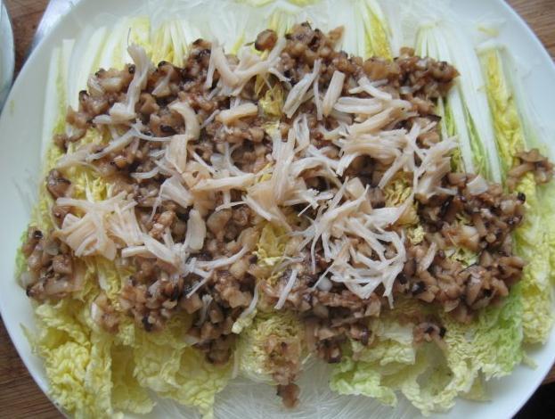 7、把泡好的干贝撒在娃娃菜上,然后蒸锅加水烧开后放蒸锅,将码好盘的娃娃菜上锅蒸10分钟;