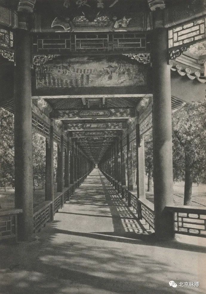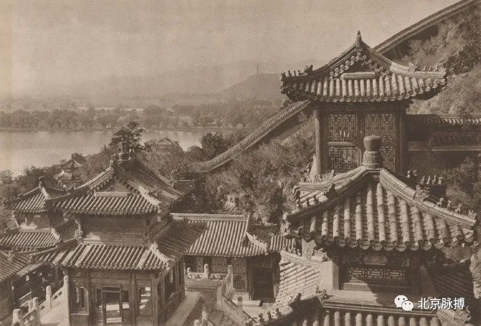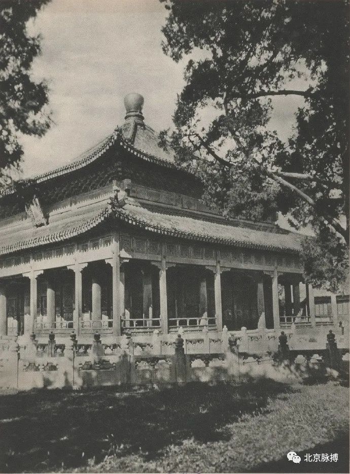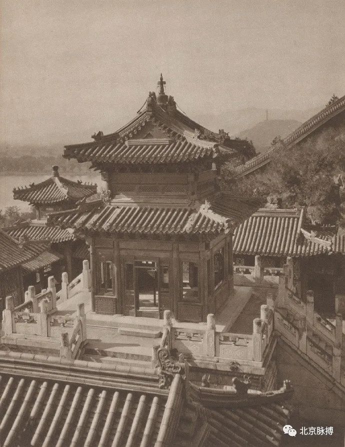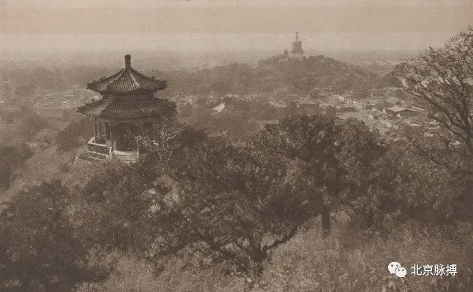 景山五亭之辑芳亭,西眺北海琼华岛白塔