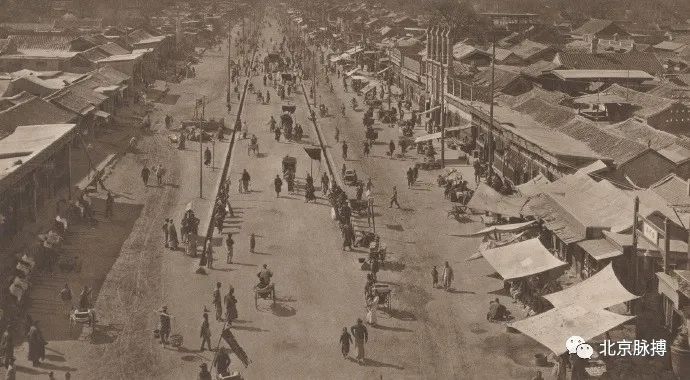 朝阳门内大街,由城楼上向城里拍摄,道路两侧修了排水沟