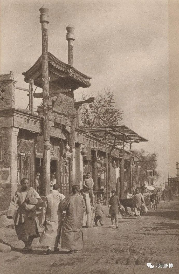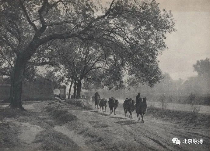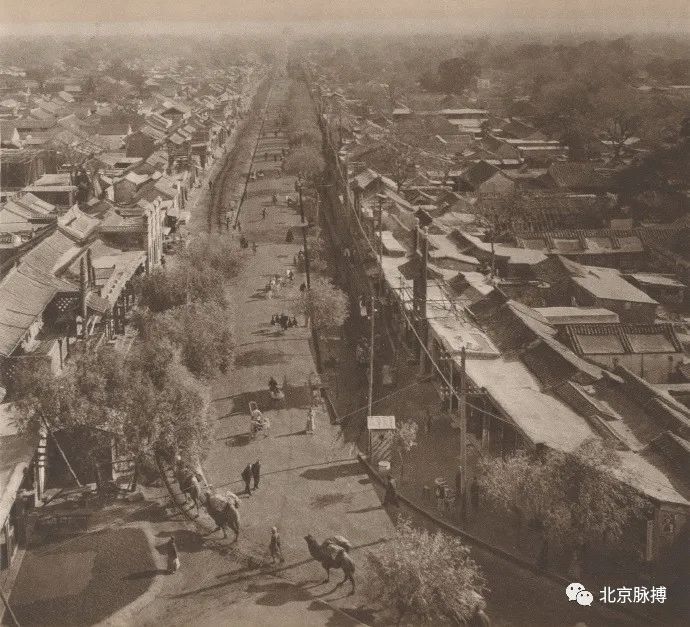 鼓楼东大街俯瞰,街道已新铺装,修了排水沟。街道上有驼队经过,还有人力车