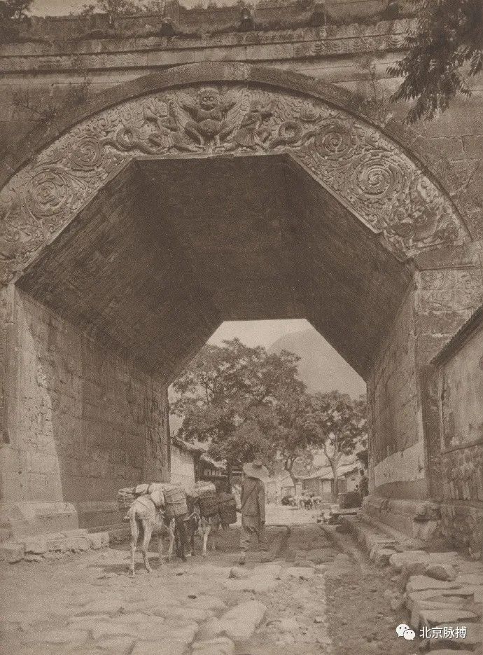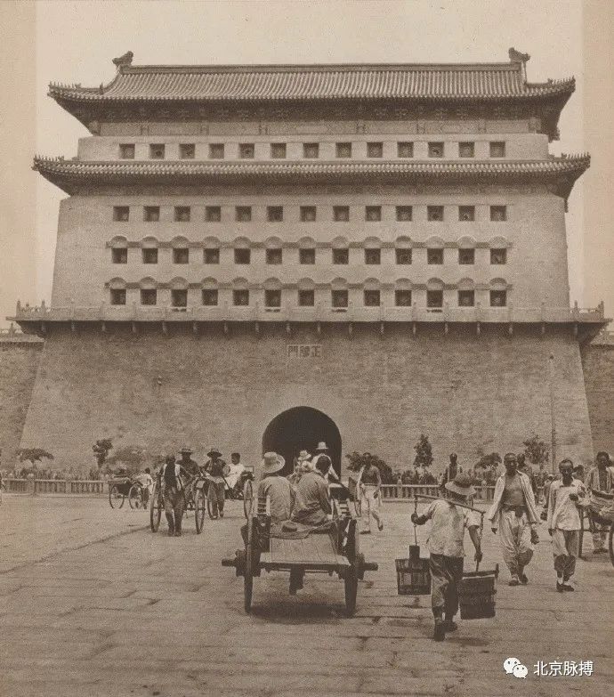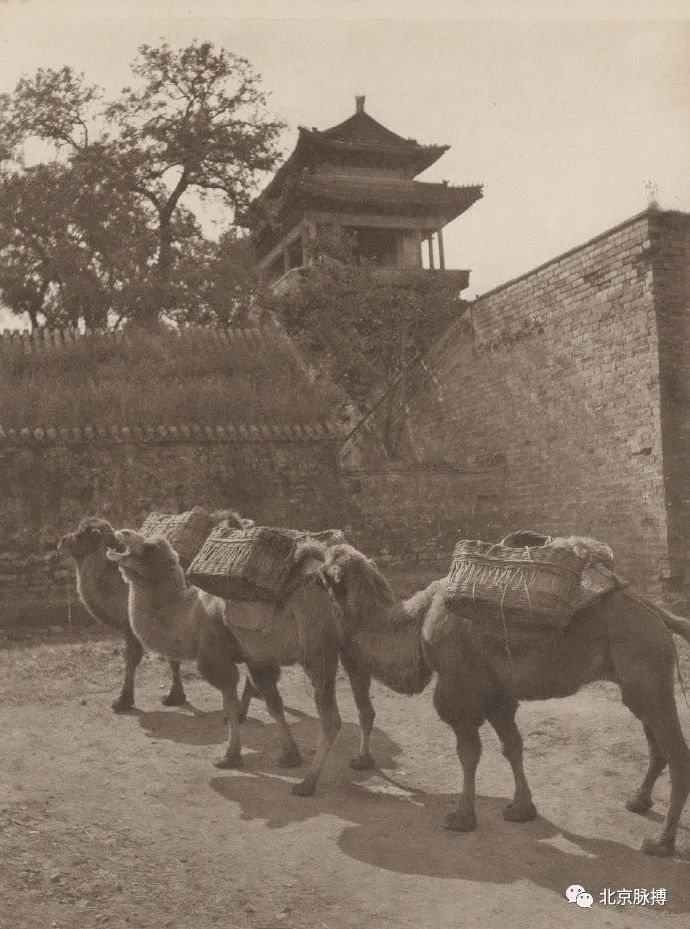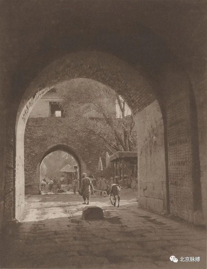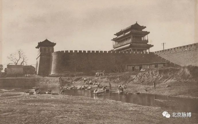 广安门城楼北面(城里),城墙下的驼队顺内城根南行,可见倒八字登城马道