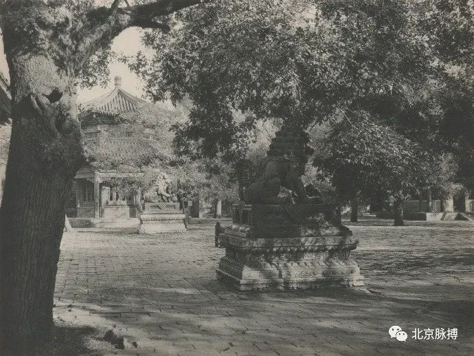 雍和宫天王殿前铜狮和碑亭