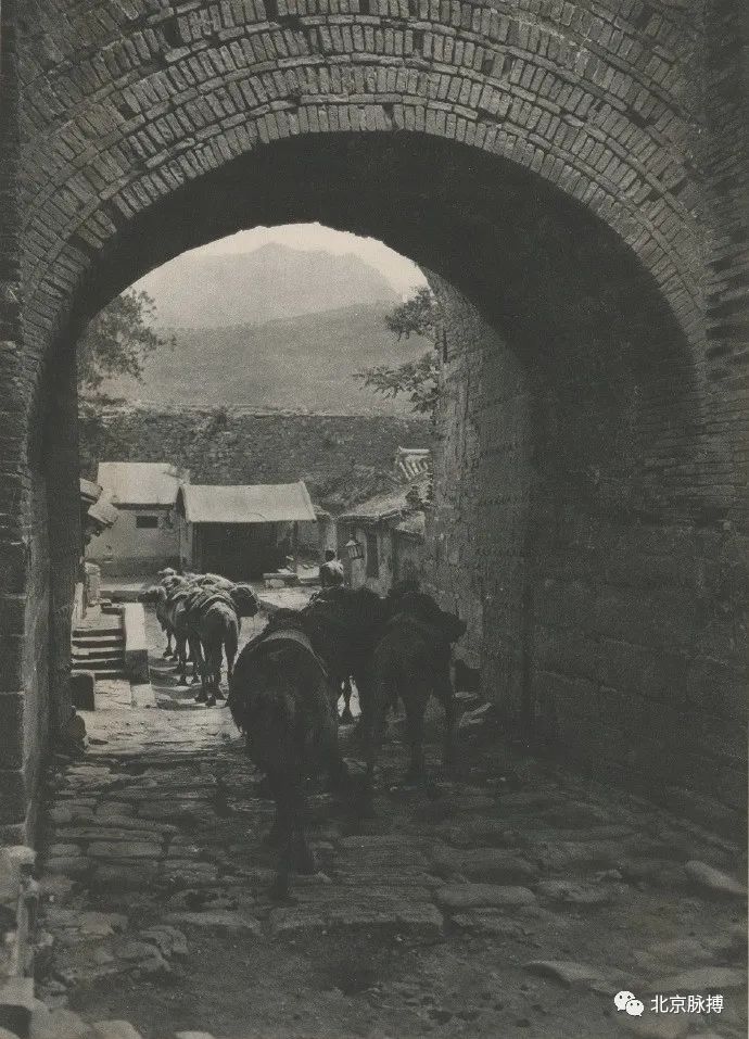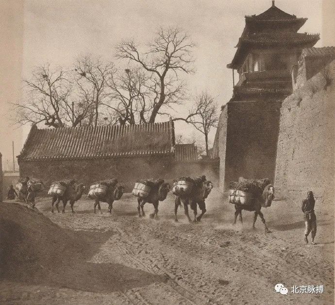 广安门城楼北面(城里),城墙下北行的驼队,可见倒八字登城马道