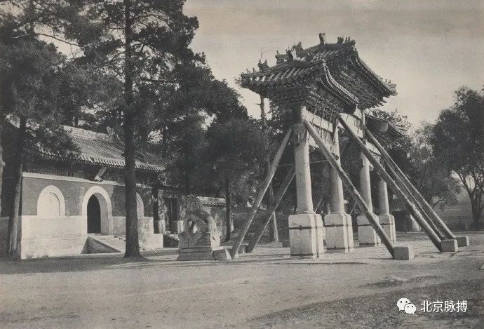 北海琼华岛永安寺山门,堆云牌楼西侧,桥牌楼前石狮面向山门