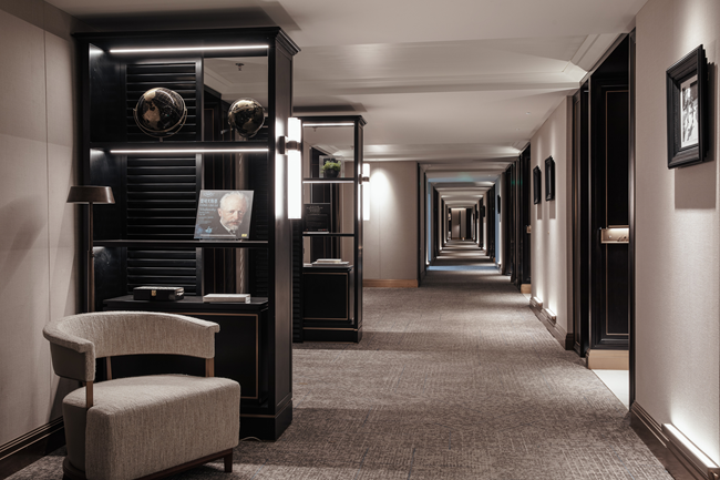 抵达酒店后,可见高大繁茂的香樟树掩映着优美沉静的欧式庄园建筑。穿过厚重的铜艺大门,推开专属定制的S型握把,步入大堂,独具匠心的私家“图书馆”呈现在眼前:捷克Lasvit品牌的手工吹制水晶吊灯,层层叠叠状如落雨,璀璨耀目的悬挂于大堂中央,与两侧经典的高耸黑色书柜相映成趣。同品牌的定制水晶镀金屏风由深金色过渡至浅香槟色,巧妙地呈现出如流水般的线条设计,在光影映衬下显得格外晶莹剔透。纵贯整个大堂空间,黑与金的色调搭配贯穿其中,再现了南京金陵帝王州的气韵,经典中不失高贵优雅。