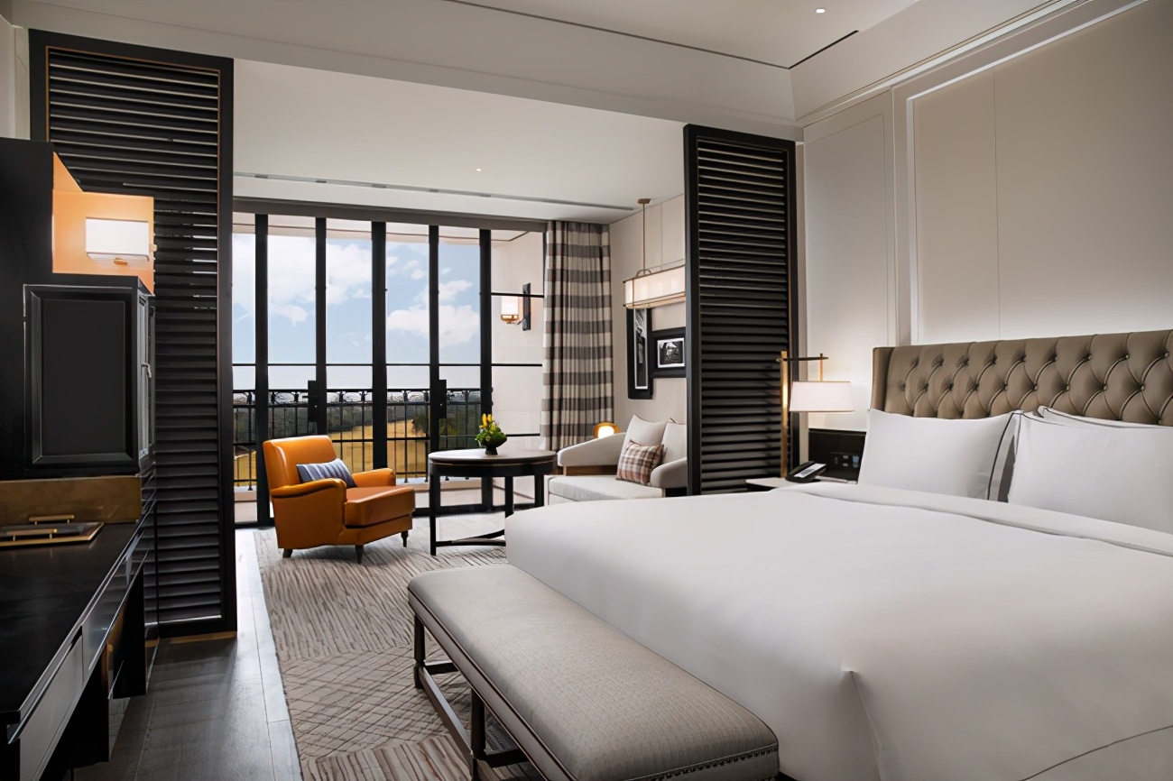 262间典雅客房延续公共空间的黑、金双色搭配,同时融入暖木色,给人以宁静舒适的居家体验。房间宽敞明亮,空间疏朗大气,室内装饰以定制家具搭配木制百叶窗、白色烤漆板等东方古典美学装饰细节,营造出府邸式的旅居环境。设计师还巧妙地将室内外环境相结合,使每间客房都呈现出不同的曼妙景观,有些俯瞰四时不同的园林花木,有些眺望起伏绵延的苍翠远山,部分房间更拥有180度全景户外露台,可将秀美的果岭景观一览无余。