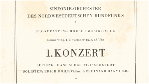 1945年11月1日下午6点,乐团举行了第一场公演,举办地是汉堡音乐厅——如今被称为“广播之家”,曲目包括贝多芬的《艾格蒙特》序曲、勃拉姆斯的《a小调二重协奏曲》,以及柴可夫斯基的《e小调第五交响曲》。
