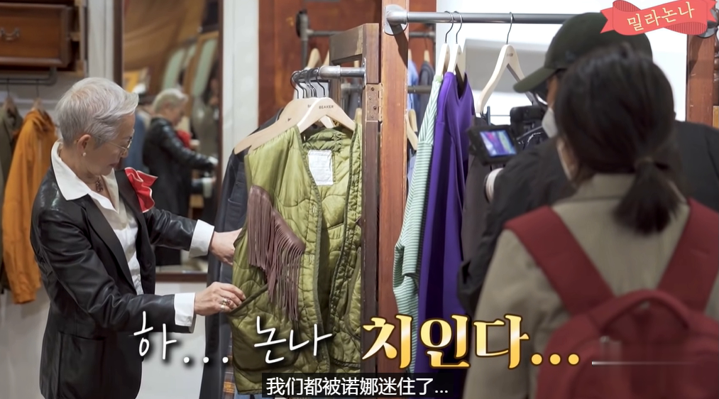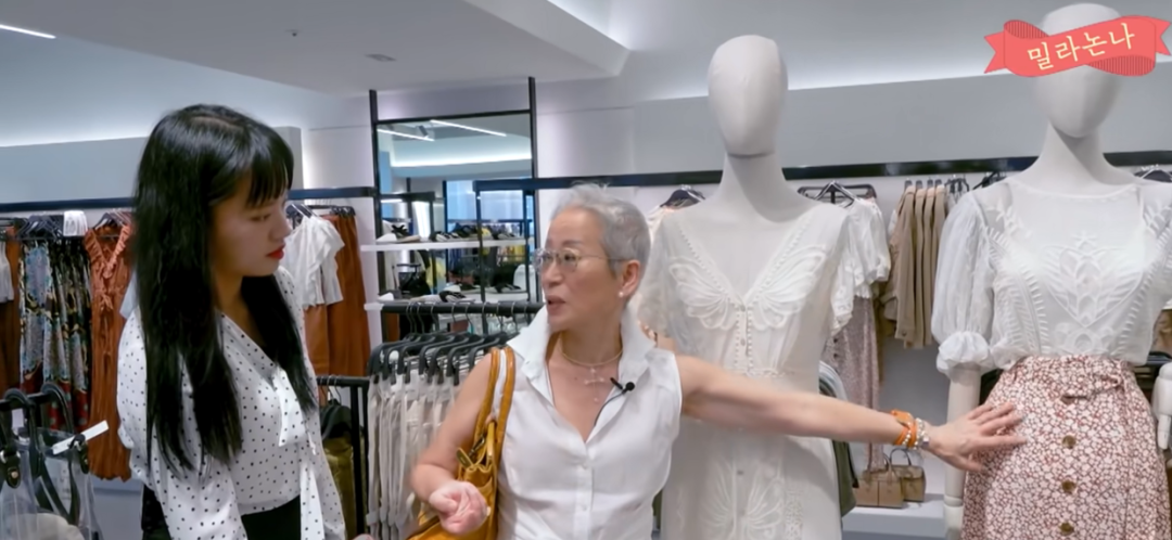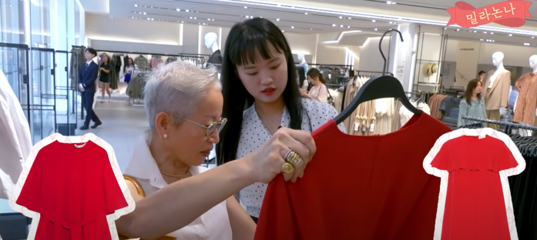 视频里,年轻的韩国小姐姐带Milanonna逛zara。这是奶奶第一次逛zara,但她很快就反客为主,给小姐姐介绍起架子上的各种服饰的创作灵感,来源于什么品牌的风格。