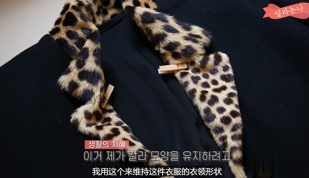 有领子的衣服要用小夹子夹起才不会变形,露出名牌衣服的logo太俗气,可以用小方巾遮起来。看她的视频总能学到一些搭配小知识。