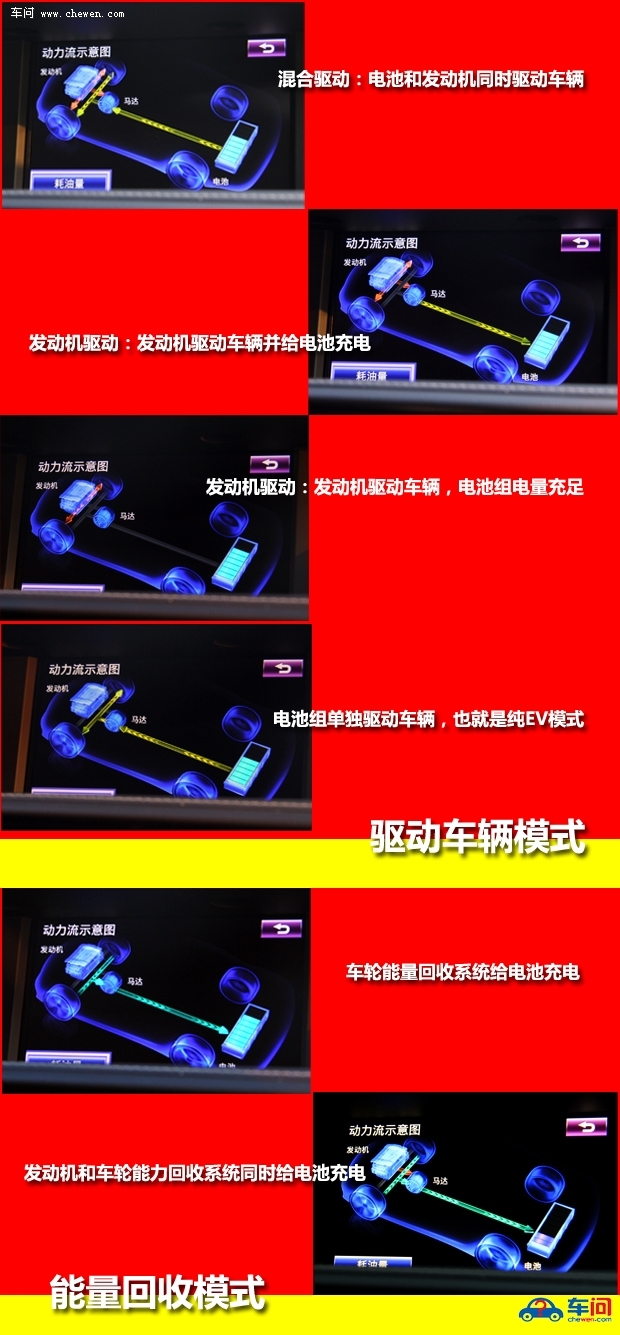 我们今天暂不去探究复杂的技术理论,就是想直观地告诉大家THS-II在能效方面有多极致。这种“极致”可不像某些品牌新闻宣传稿件里的纸上谈兵,诸如“智能化新能源系统将帮助车主实现节能最大化”这样的字眼简直就是在欺骗消费者。下图是小编拍摄的一汽丰田双擎动力流示意图:驱动工况包括混合驱动、发动机驱动、电池组驱动等四种组合,能量回收工况下包括两种组合。而每种工况模式背后的触发逻辑都是由THS-II芯片控制,这就涉及到绝对的核心了。