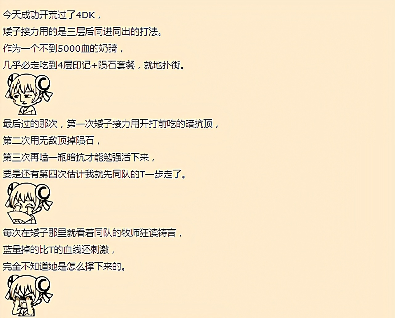 这里先引用一个玩家的亲身经历来抛砖引玉。这个玩家所在的团队刚刚开荒过了4DK,在矮子这里接力的时候都是采用3层印记后同进同出的打法,他作为一个不到5000血的圣骑士,几乎每次都会吃到4层印记加陨石AOE然后倒地。