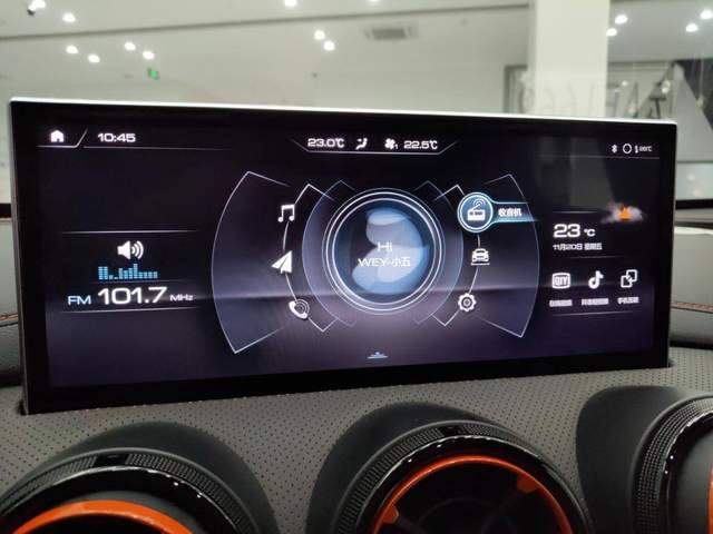 不得不说的是,2021款WEY VV5元气橙版在中控平台上配备了一块支持全屏触控12.3英寸屏幕,内置智能的讯飞飞鱼2.0语音识别引擎,支持日常语音唤醒和车内各项智能语音的控制功能。