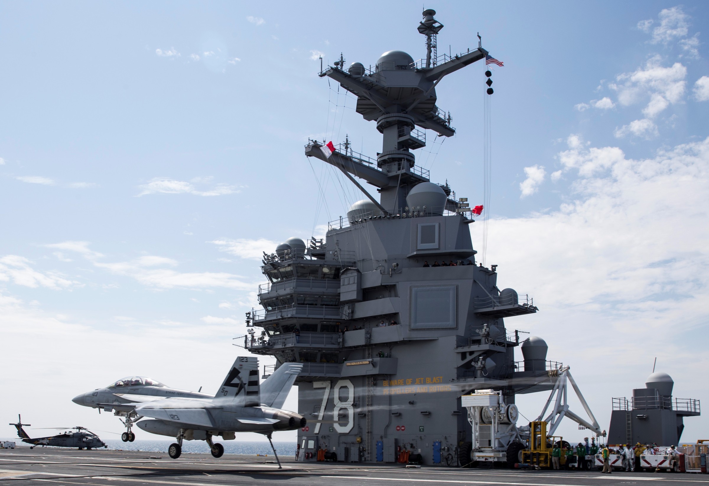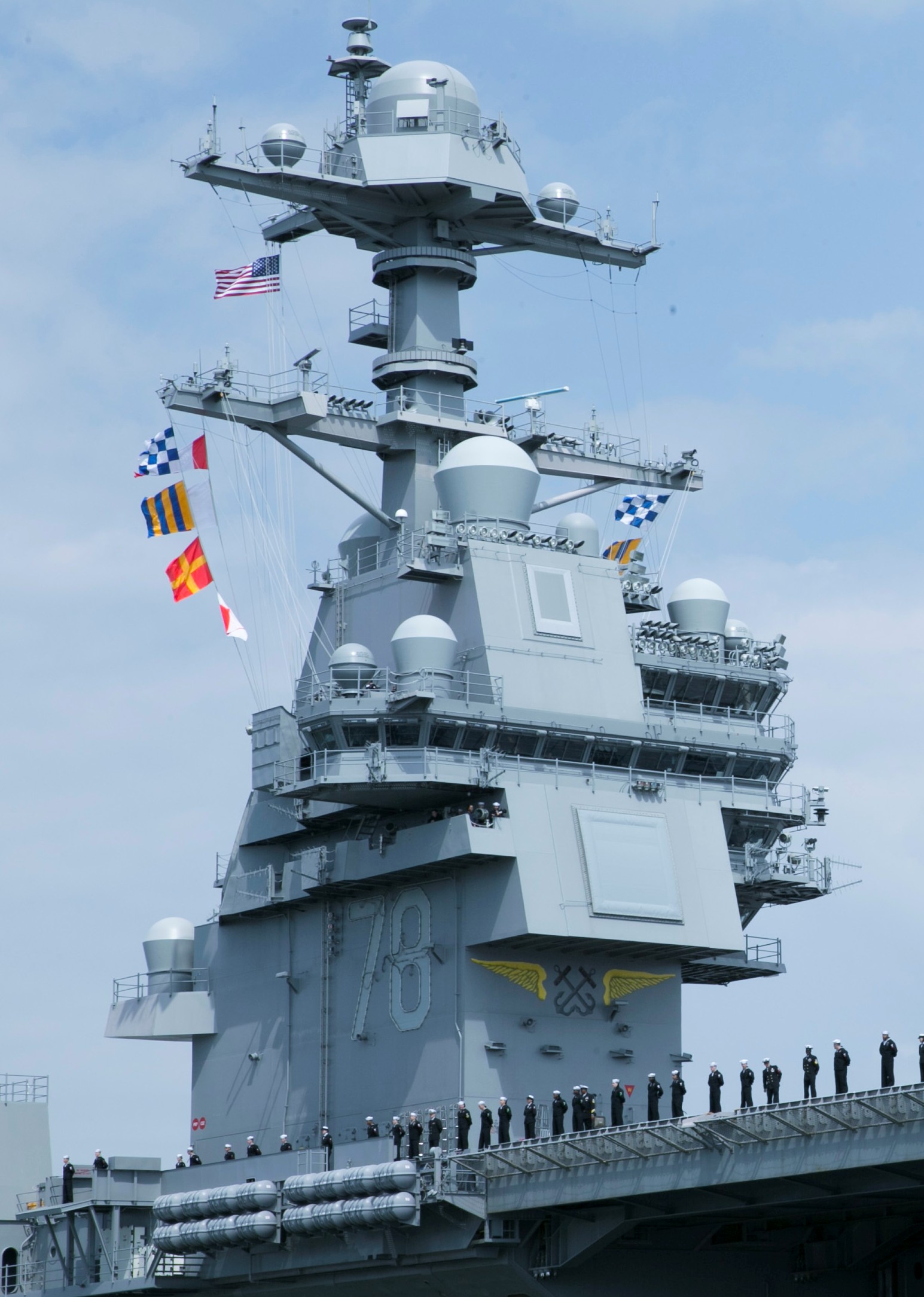 直观上看,“福特”号舰岛比上一代“尼米兹”级航母更小,位置上更靠尾部、略偏右舷,结构上,“福特”号有3个升降台和两个机库,每个机库只有两个分区,以简化维护。而较小的舰岛设计可以容纳由DD(X)计划所发展出的新式双频雷达(Dual Band Radar,DBR)。
