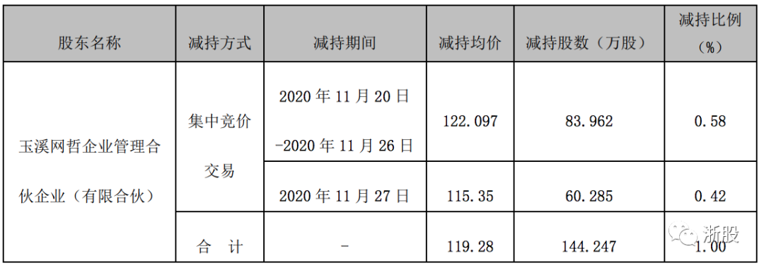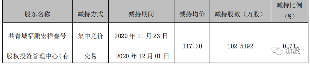 10月13日,福鹏宏祥通过大宗交易减持288.5万股,占总股本的1.999997%,价格约141.82元,当日套现4.9亿元。