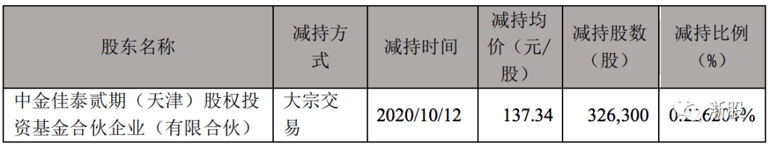 10 月12日,中金佳和通过大宗交易减持326,300股,减持后持股4.999981%,低于5%。