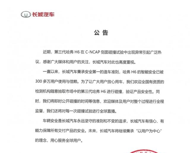 12月24日,长城汽车哈弗品牌也快速给出了第一份声明。初步判断为车辆在碰撞时处于断电状态,此状态下气囊相关组件和车身控制系统等均不工作,导致以上异常,并会针对断电原因进一步排查及技术分析。时隔一天,长城汽车便发来了第二份声明,内容相当简单粗暴了,大概就是随便大家测,我不亏心也不害怕,欢迎直播。态度小编还是欣赏的,毕竟能正面回应值得赞赏,这也恰恰证明了,长城对第三代哈弗H6是充满信心的,无疑为广大车主吃下了一颗定心丸。