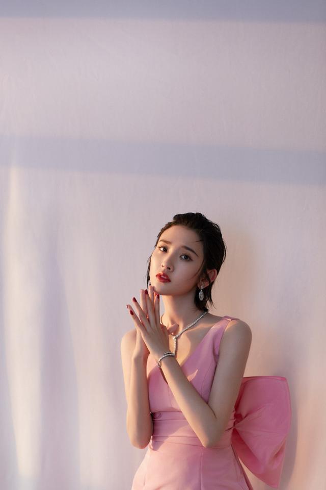 粉色相比起其他颜色来说,最容易制造出浪漫氛围。不过粉色作为服装的主色调时,对穿着人的肤色气质要求很高。唐艺昕无论皮肤状态,还是整体肤色都很优越,因此才能驾驭这样一身粉色裙子造型。