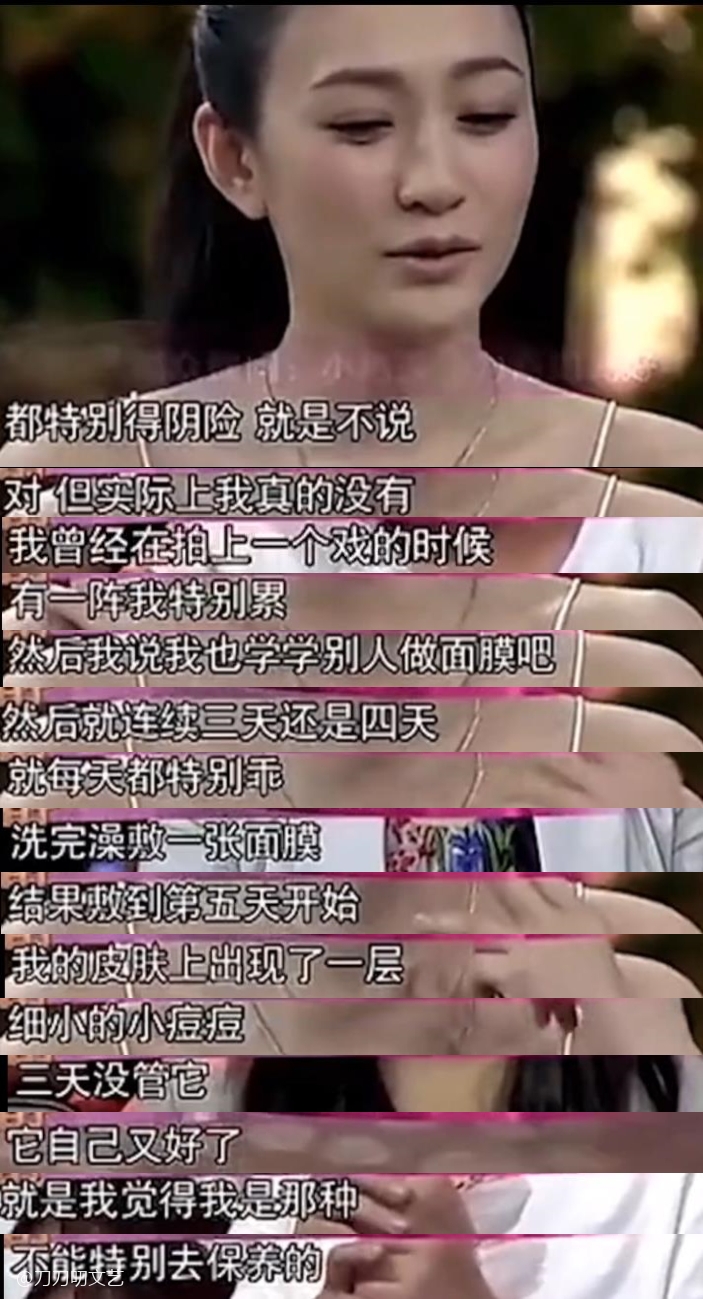 几乎从来不敷面膜,有次拍完戏觉得累,就连续敷了三四天面膜,结果第五天脸上起了一层小痘痘!她三天没管它、也没继续敷面膜,痘痘自己好了!
