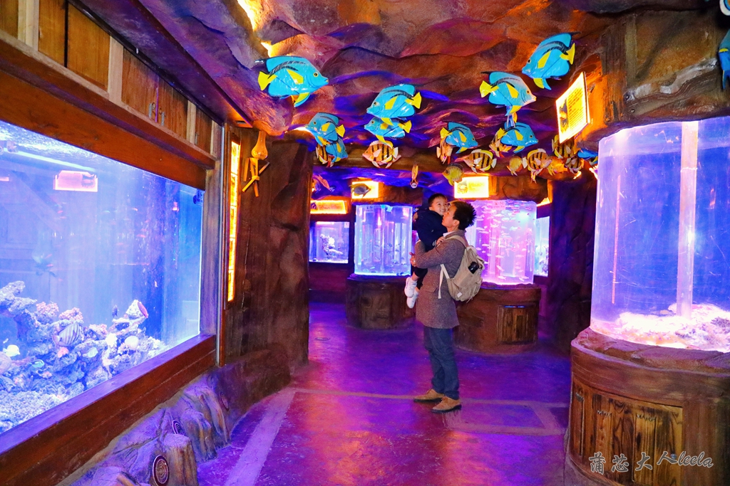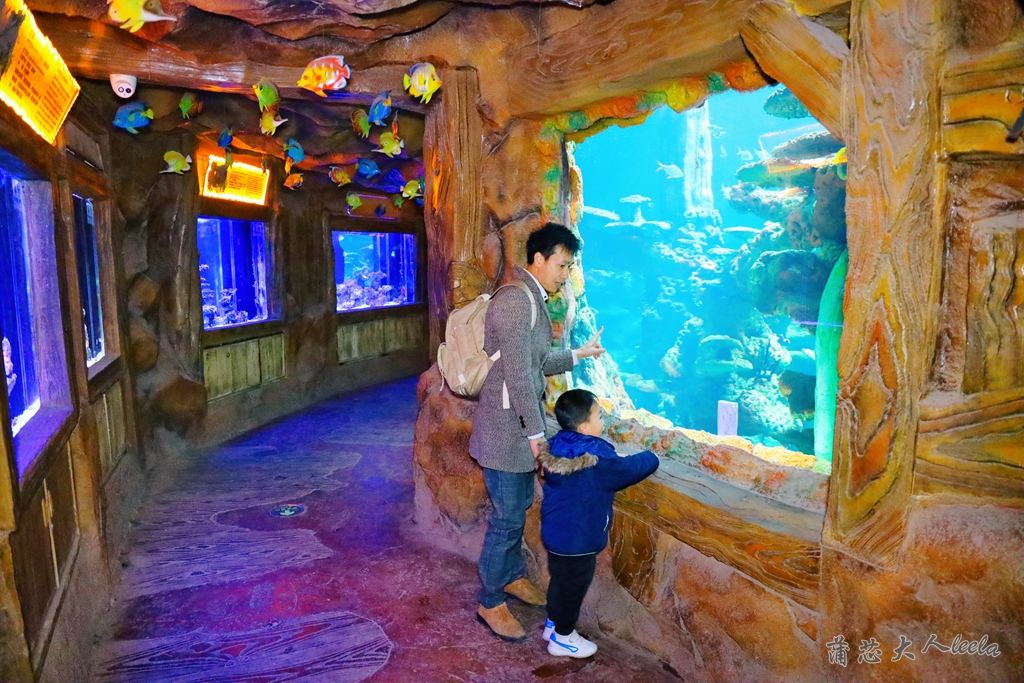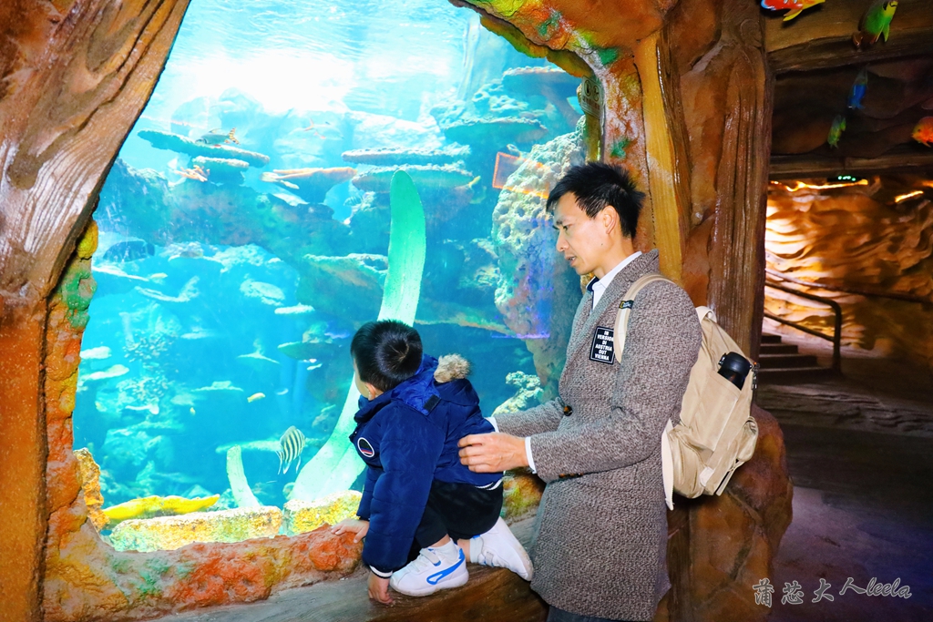 曲折迂回的矿洞海底隧道很适合拍照,宝宝趴在玻璃上惊喜不断,开心指着鱼群问我们这是什么。