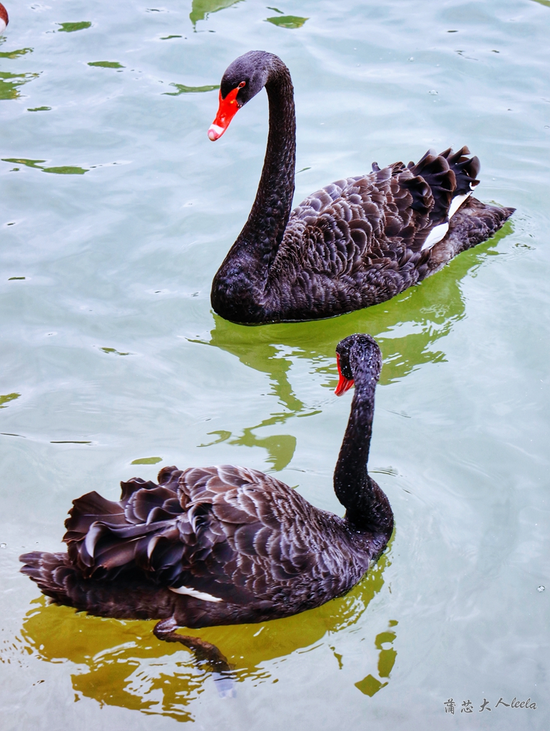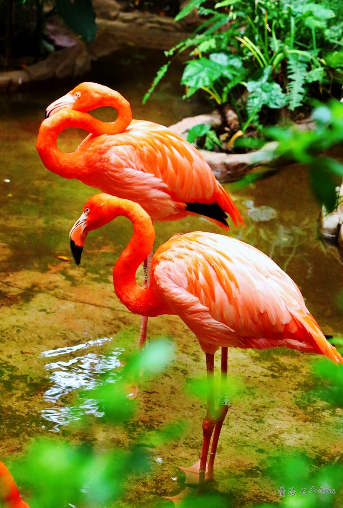 火烈鸟在河中忙着觅食,它们的羽毛是深浅不一的桔色,眨眼一看还以为打翻了颜料盒。