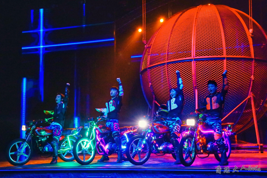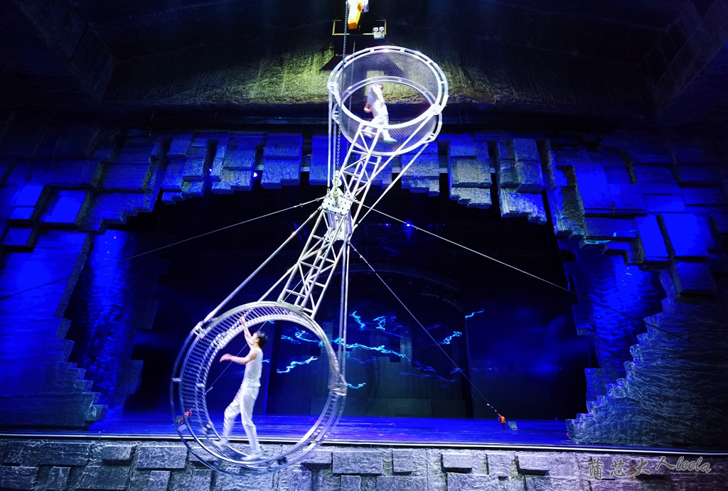 大飞轮不断滚动很惊险,两位艺人在飞轮上奔跑、跳绳、杂耍甚至蒙着眼睛跑步,随时都有掉下来的危险,吓得我惊声尖叫!