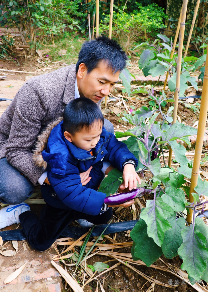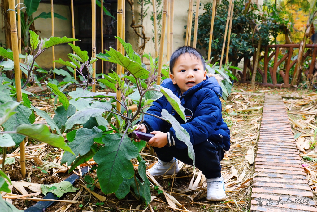 我们住的田园小院是独栋别墅,有自家菜地、独立阳台和超大的房间,院子里种满了茄子,宝宝说要摘回家炒菜吃,却被我阻止了。