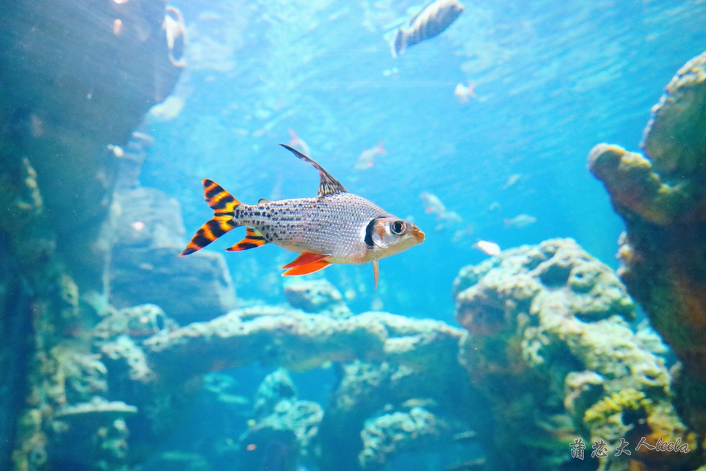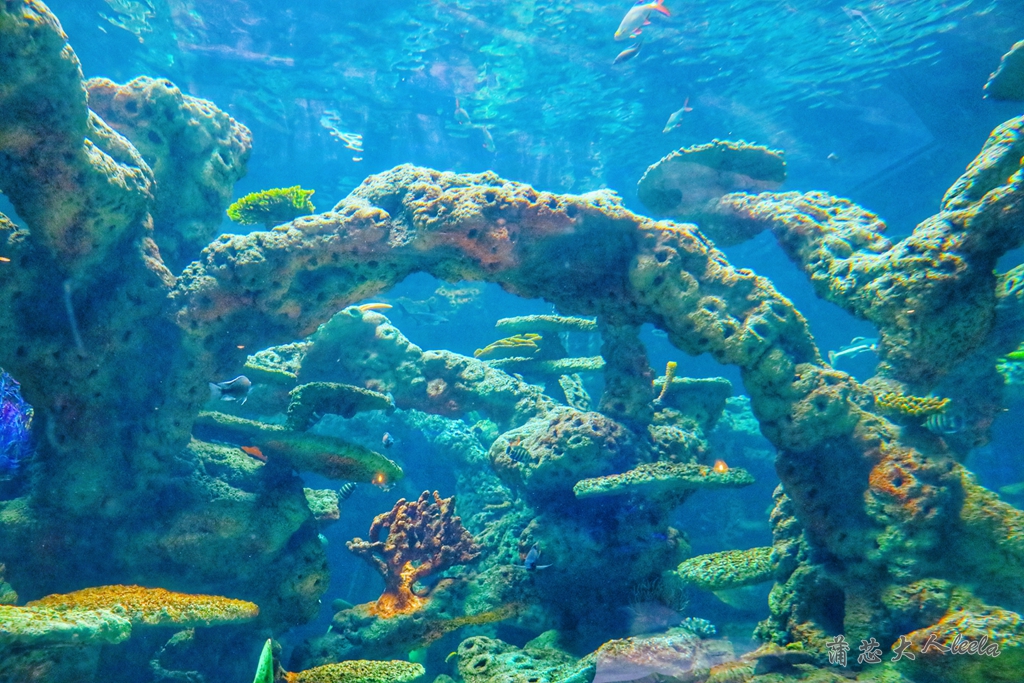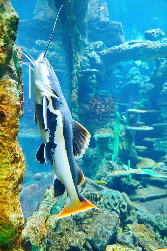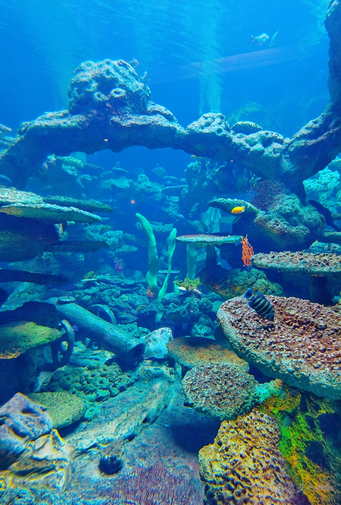 走进矿洞海洋馆,就像进入蓝色海洋世界,海底有珊瑚、海星和海蛇,不时有鱼群游过,还能看到魔鬼鱼、鲨鱼等海洋生物。