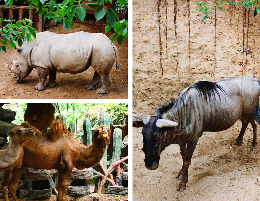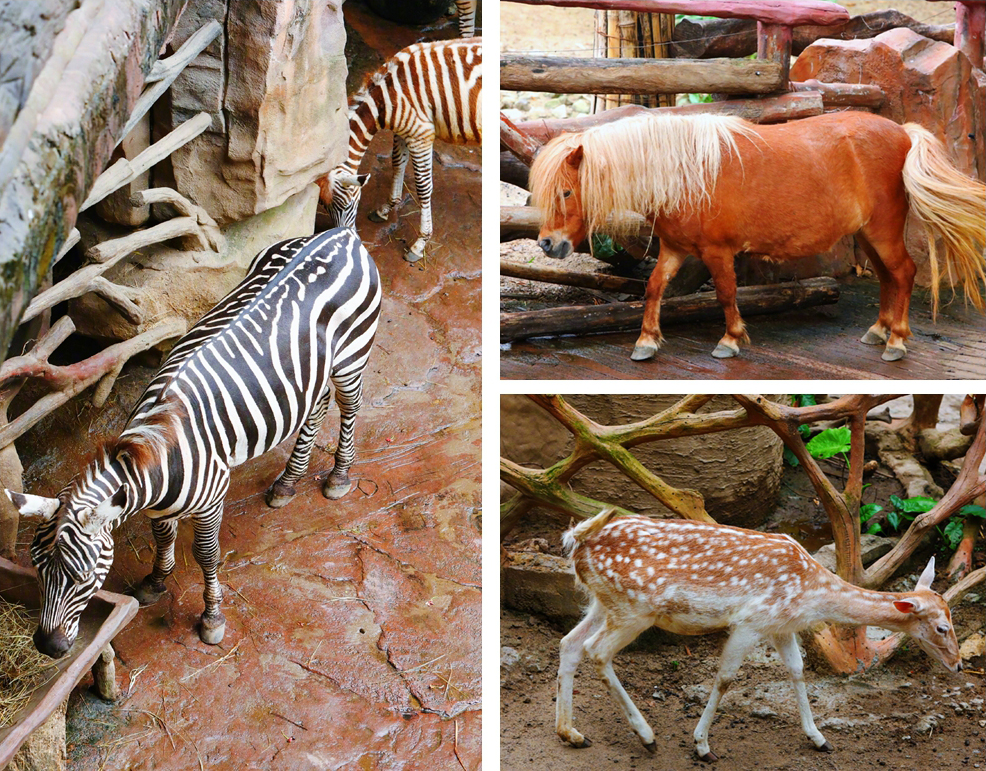 大草原区有斑马、耳廓狐、火烈鸟、金钱豹、梅花鹿、驼羊、珍珠矮马等等。