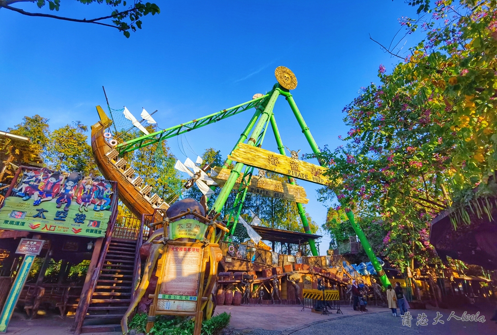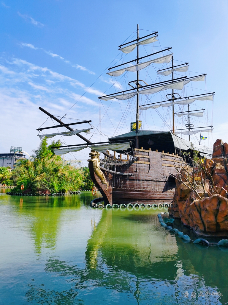 吃完早餐带娃出发,广州到顺德1小时车程,到达长鹿休博园后,我们先去兑换门票,门票有游乐金,可以体验园区机动项目和动物表演。一进景区门口,我就被哥德堡号鬼船吸引,赶紧让父子俩拍照打卡,接下来就是难忘的快乐旅程啦!