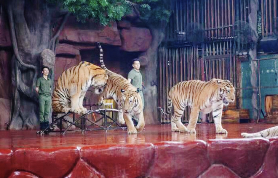 海陆空动物表演非常好看,每种动物都才华洋溢,猴子会骑单车、狗熊会跳高,就连老虎、狮子都出来捧场。可惜我们没及时留意演出时间,只看了一点点,宝宝全程开心鼓掌,还跟我们说下次还要来看动物表演。