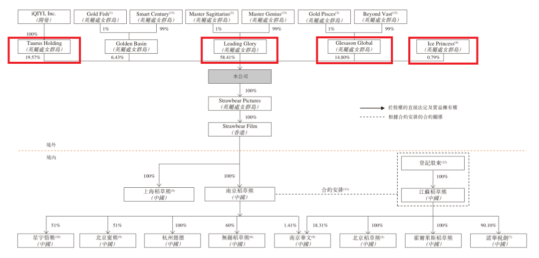 IPO前股权架构显示,稻草熊的第一大股东为刘小枫,持股比例为58.41%,其余股东包括爱奇艺持股19.57%,刘诗诗通过Gold Pisces持股14.8%,赵丽颖通过Ice Princess持股0.79%。