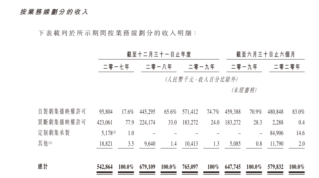 从营收构成来看,稻草熊的收入来源于自制剧、买断剧的播映权许可,以及定制剧的承制服务。其中自制剧集收入在2020年前6个月达到4.81亿元,占比为83%;定制剧收入达到0.85亿元,占比为14.6%。