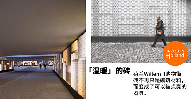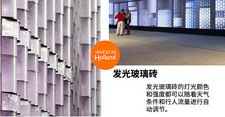 Van Tetterode玻璃工作室和飞利浦照明公司一起开发出的“发光玻璃砖”,通过质地与光感将砖这一古老的材料赋予了新的生命。发光玻璃砖的灯光颜色和强度都可以随着天气条件和行人流量进行自动调节。
