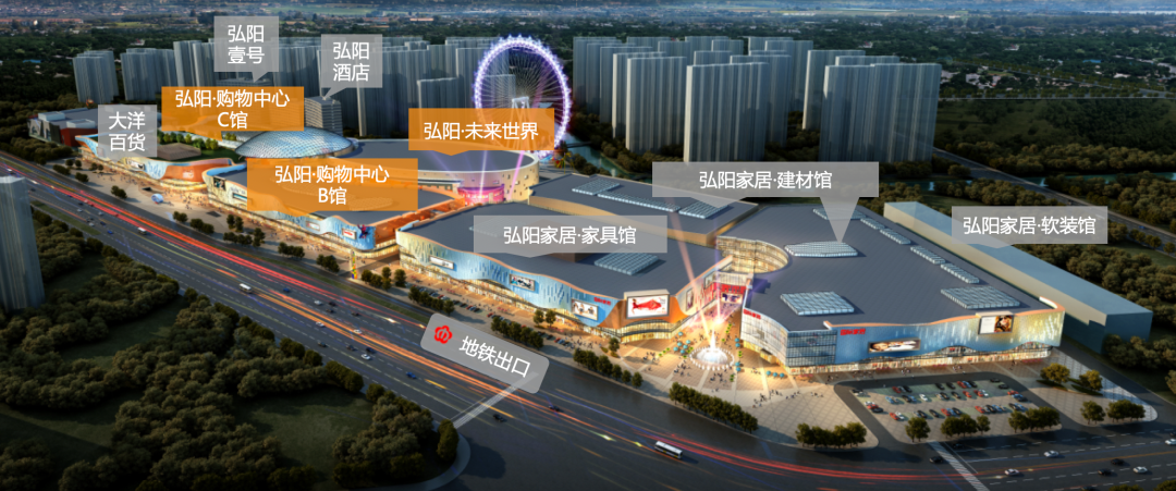 以中心秀场为原点,联动弘阳广场、未来世界主题乐园及弘阳酒店,让消费者与商场、城市、商业产生情感共鸣与联结,打造“永不落幕的城市秀场”。