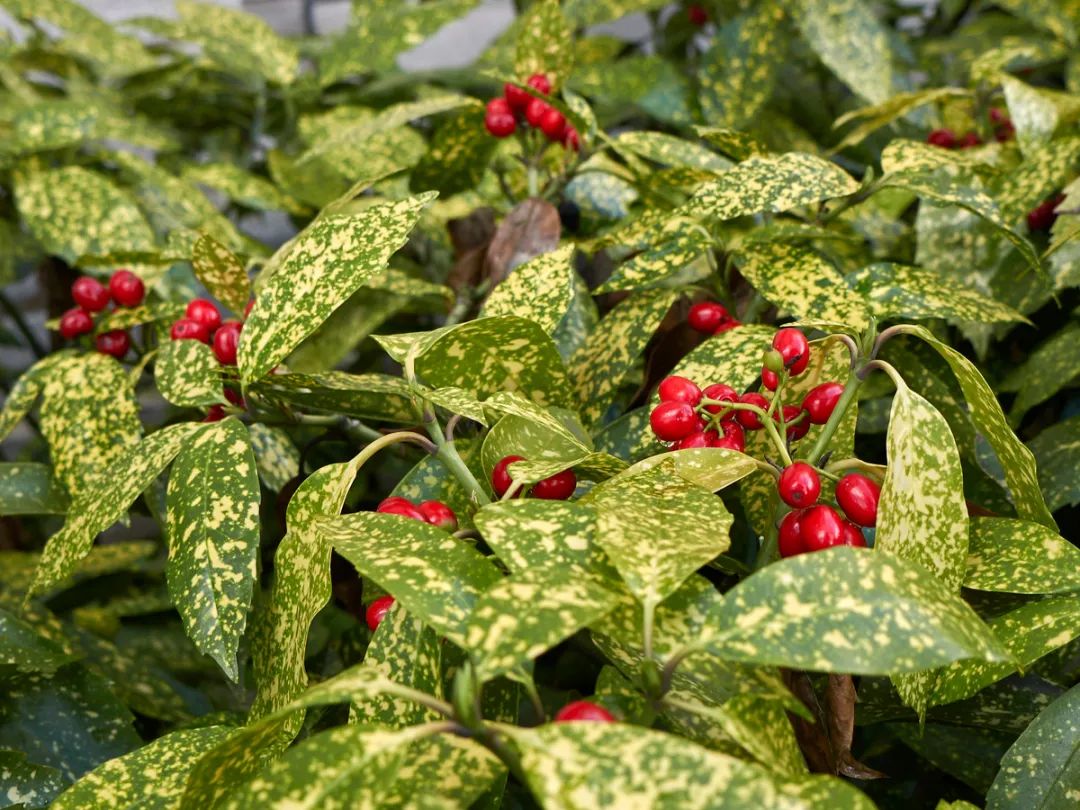 桃叶珊瑚在偏南地区经常会被用来作为绿化植物栽种(特别是两广、云南和福建等地),它的叶片整体是呈翠绿色,有较多光照叶片会变成偏黄色,叶面上有着很多金黄色的斑点,斑斓的叶子是非常引人注目的。