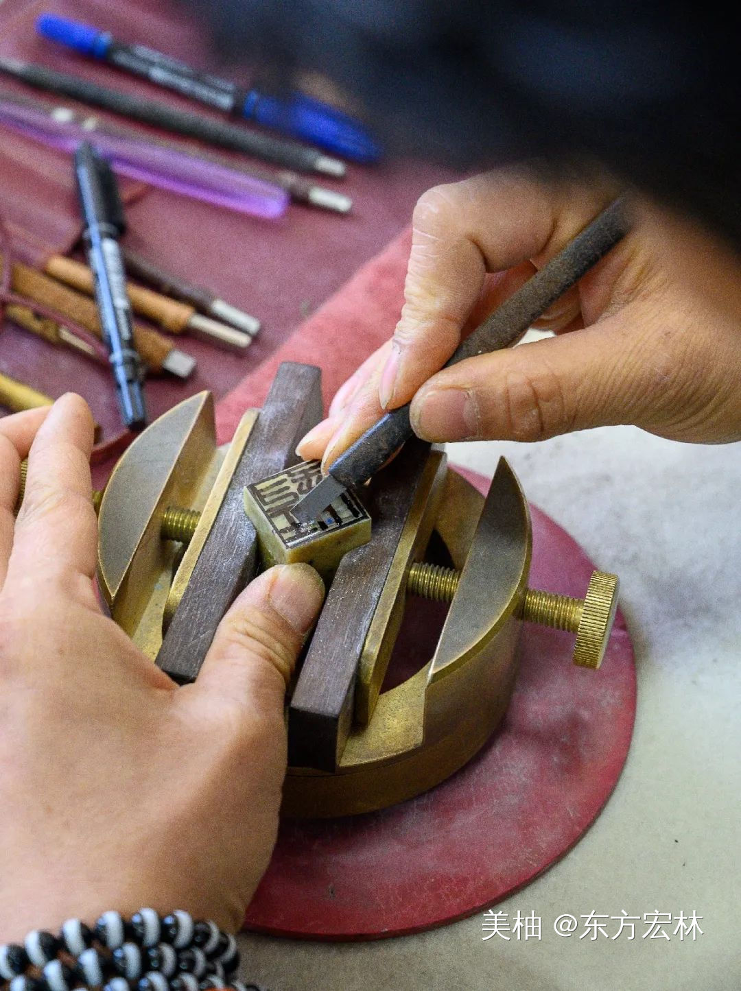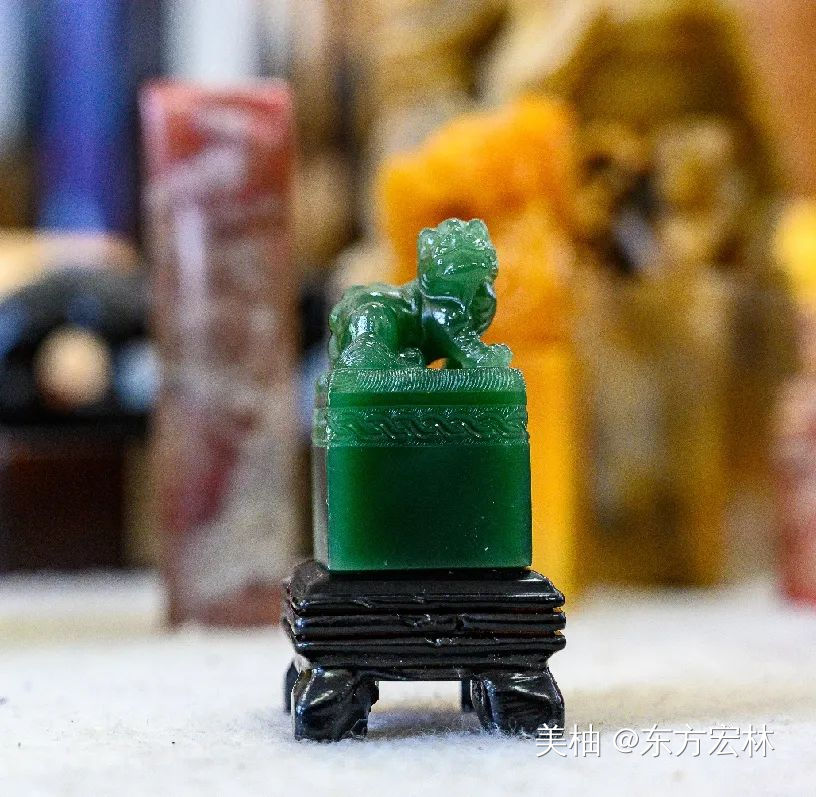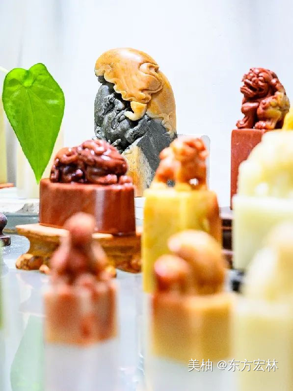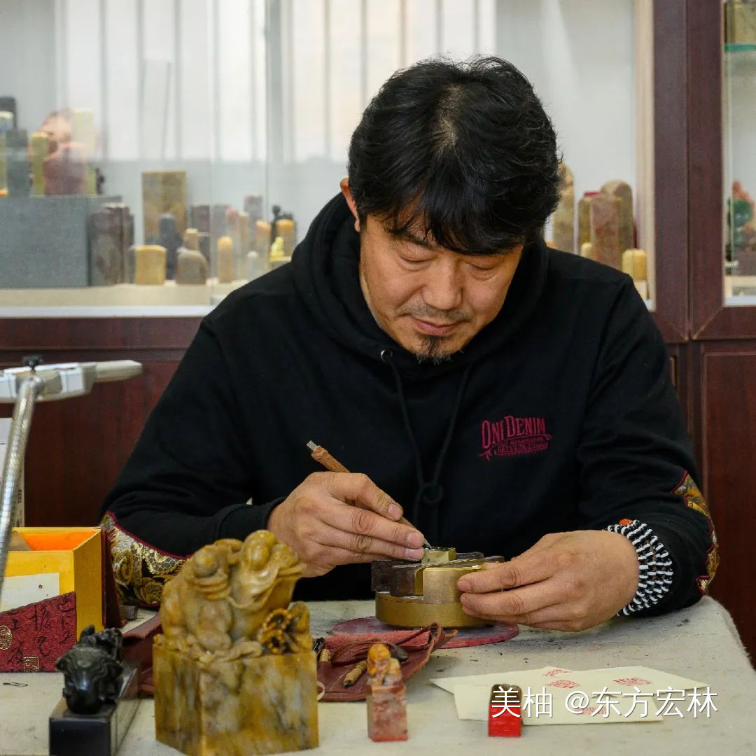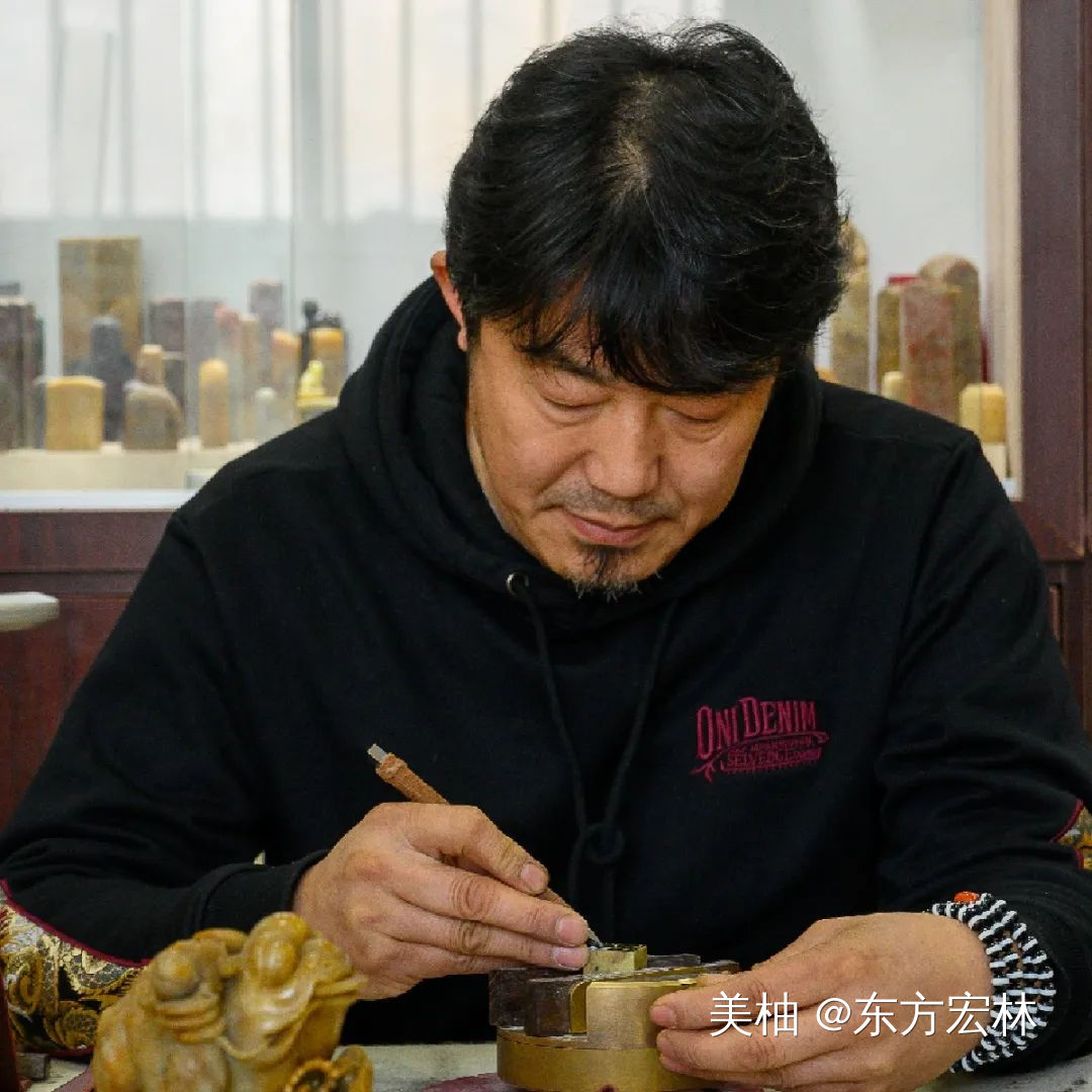 Q:现在印章的使用机会太少了,篆刻这门艺术技艺就更令人陌生了。一开始你是如何学习的?H:一开始学习主要是刻佛造像,它能练刀工,一是刀感,二是线条感。然后逐步到文字,先是小篆也就是秦篆,最后是大篆,就是那种刻在青铜器上的文字,比如石鼓文、甲骨文,还有金文等等。你要先把文字反着写在印章上,然后再刻。除此之外,还要涉及到布局、线条,就好比书法艺术中讲的浓淡干湿,对审美有更高的要求。小篆