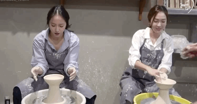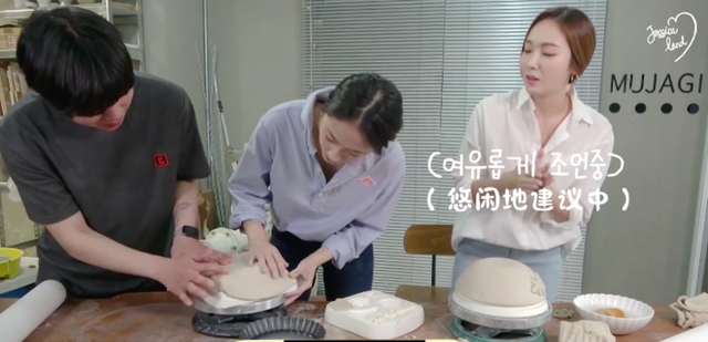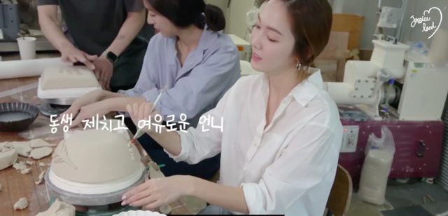 之前她还和妹妹郑秀晶一起做了陶艺,旁边妹妹盘子的造型还没做好,这边Jessica都已经贴上装饰了。