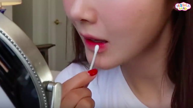 为了打造不显利落的眼线,她将眼线胶与眼影盘的颜色融合在一起,唇妆先用唇部遮瑕模糊唇线,涂上口红后利用棉棒过渡,这样可以让韩式裸妆的效果更出彩!