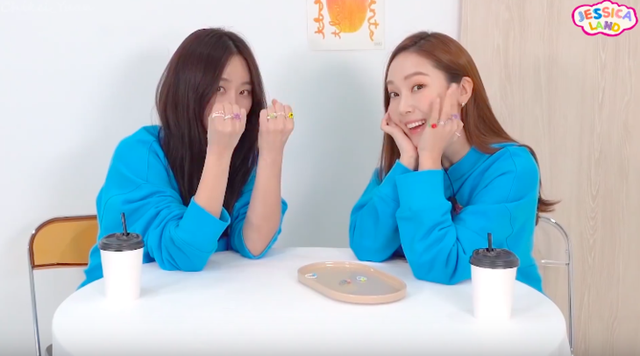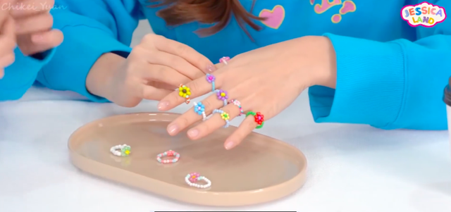 Jessica在家的时候也会做点小手工,可可爱爱的串珠戒指立刻给大家安排上,戒指的配色整体协调又清新,甜妹必备。