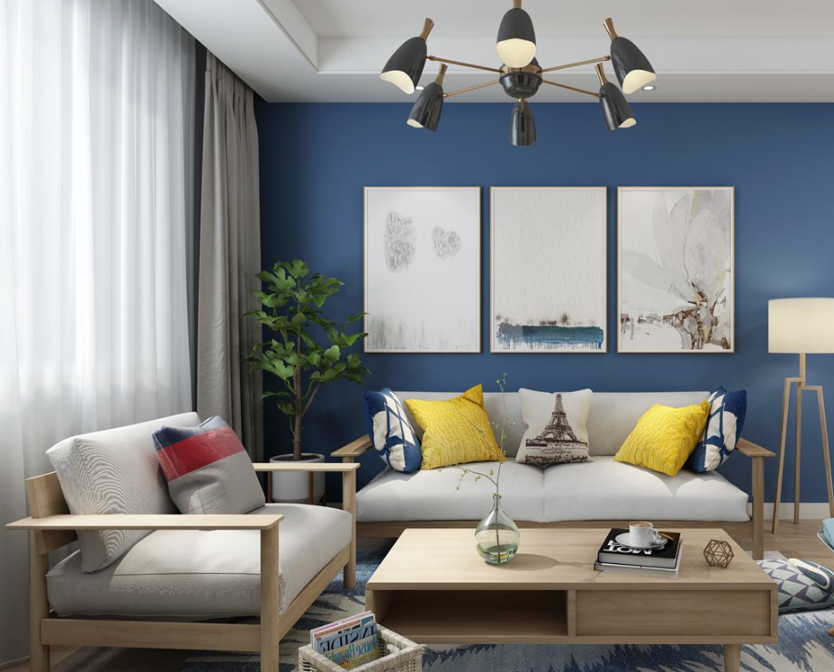 客厅:整个沙发背景墙选择刷上藏青色的墙漆,使用白色主调带有艺术气息的装饰画调和沉闷气息,墙角的绿植和木艺阅读灯。沙发和茶几都使用原木元素,淡淡的自然气息流露出来,随意搭配一些同样风格的抱枕、摆件,整个客厅看起来就给人耳目一新的视觉享受。